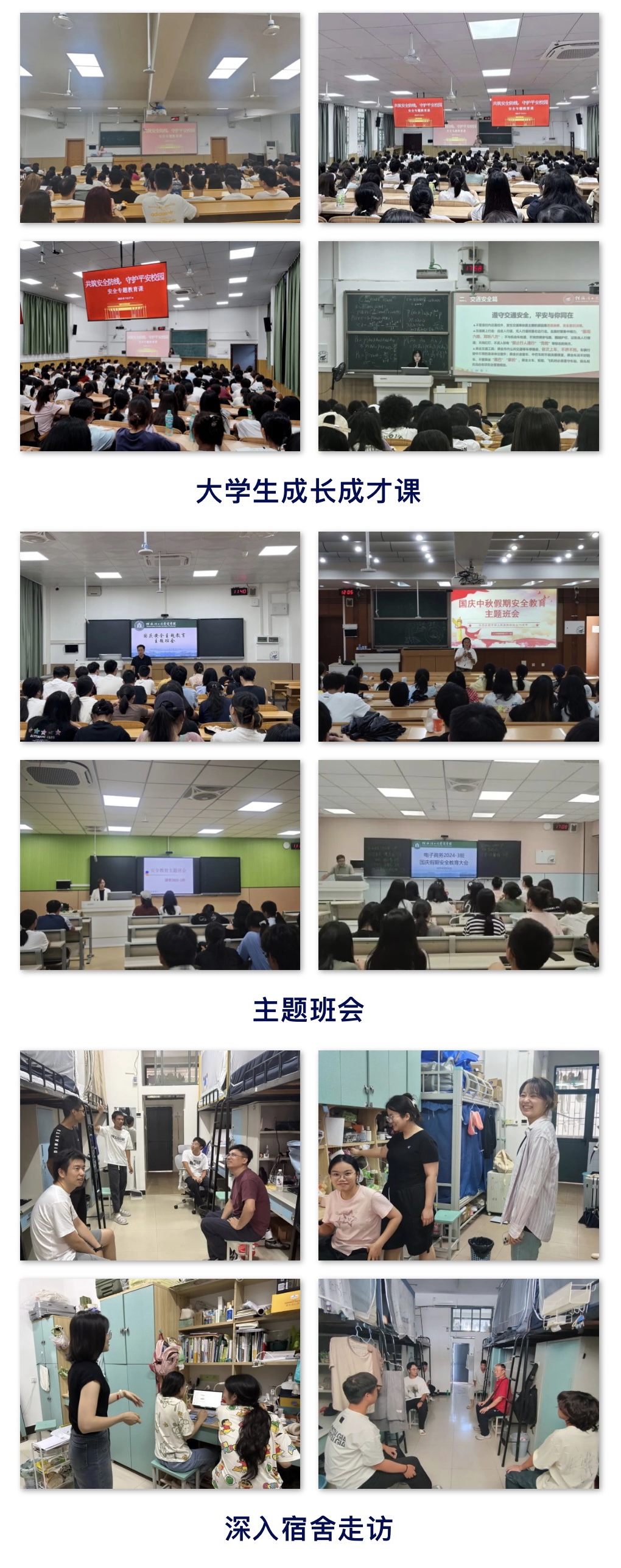 為切實(shí)做好國(guó)慶、中秋假期安全穩(wěn)定工作,進(jìn)一步增強(qiáng)學(xué)生安全防范意識(shí),營(yíng)造安全、文明、和諧的校園環(huán)境,學(xué)院于9月25日—30日,通過(guò)多種形式開(kāi)展安全主題教育,為學(xué)生的假期安全保駕護(hù)航。學(xué)院以大學(xué)生成長(zhǎng)成才課、主題班會(huì)為陣地,重點(diǎn)從假期學(xué)生管理規(guī)定、人身安全、交通安全、財(cái)產(chǎn)安全、出行安全、網(wǎng)絡(luò)安全、宿舍安全、飲食安全、防火防盜、電信詐騙、防溺水等方面進(jìn)行教育,切實(shí)增強(qiáng)學(xué)生安全防范意識(shí)。輔導(dǎo)員、班主任深入宿...