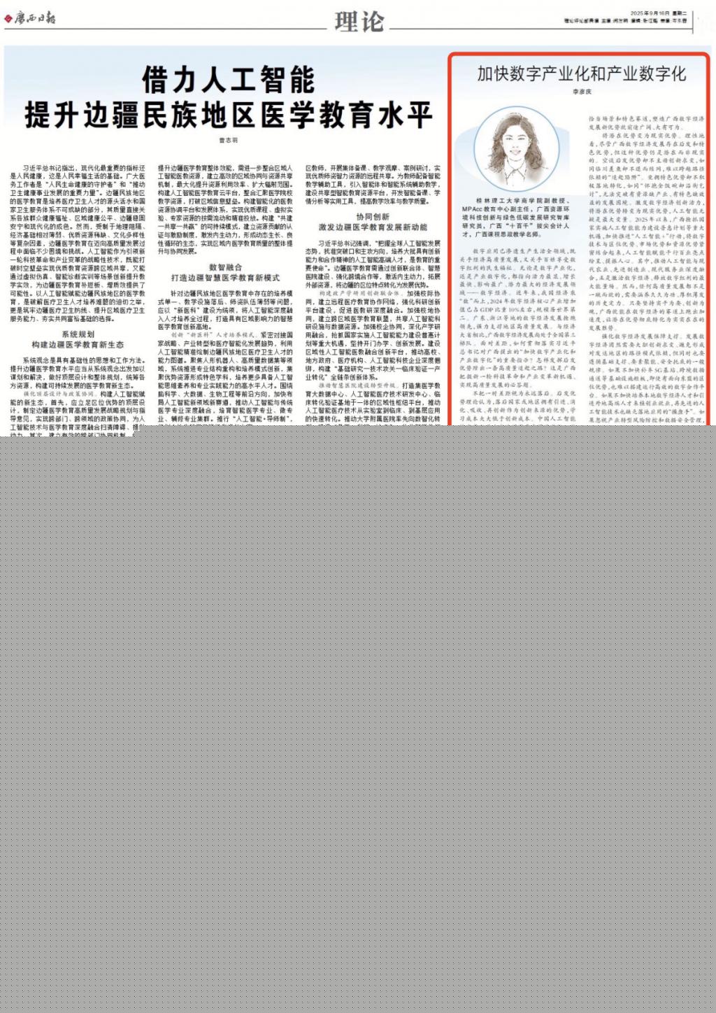 近日,《廣西日?qǐng)?bào)》“青年說(shuō)理”欄目刊發(fā)中國(guó)·永樂(lè)高131net李彥慶副教授理論文章《加快數(shù)字產(chǎn)業(yè)化和產(chǎn)業(yè)數(shù)字化》。文章從“不把一時(shí)差距視為永遠(yuǎn)落后”、“將潛在優(yōu)勢(shì)變?yōu)楝F(xiàn)實(shí)優(yōu)勢(shì)”、“強(qiáng)化數(shù)字經(jīng)濟(jì)發(fā)展保障支撐”等三個(gè)方面進(jìn)行了介紹。現(xiàn)將全文轉(zhuǎn)載如下。外宣稿鏈接:https://apph5.cloudgx.cn/article/sync1967727903722569728李彥慶:桂林理工大學(xué)商學(xué)院副教授、MPAcc教育中心副主任,廣西資源環(huán)境科技創(chuàng)新與綠色低碳發(fā)展研究智庫(kù)研究員...